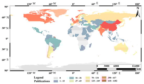 The WoS database literature record contains information on the countries and institutions where the literature is published, through which the geospatial distribution of research on the topic can be characterized. Figure 5 shows that the study is predominantly spread across 118 countries worldwide, with concentrations in Europe, North America, East Asia, and South Asia.