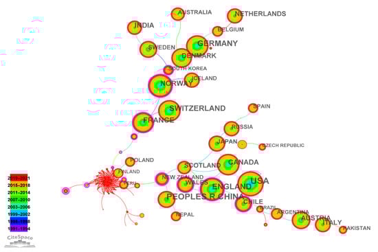 Between 1990 and 2021, the network of cooperating countries consists of 323 nodes and 1354 links (Figure 6). Obviously, there is close cooperation between the countries and regions with the most published articles. It is worth mentioning that Germany, USA, and France have a high centrality and, therefore, they play a crucial role in establishing links with other countries.