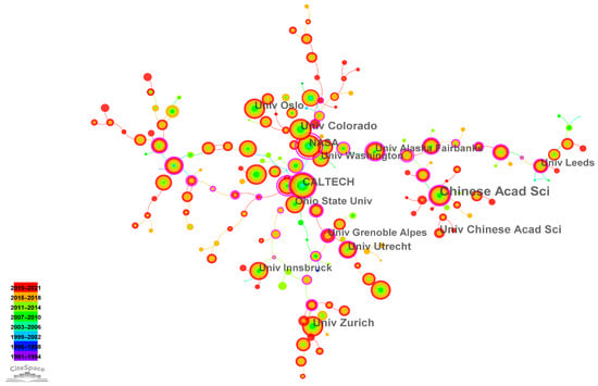 Between 1990 and 2021, the institutional collaboration network consisted of 186 institutions and 178 collaborative links, as shown in Figure 7. The relatively tight structure and close relationships indicate a relatively high level of maturity in the research community. Table 6 lists the top 10 institutions that contribute the most to the total output. The Chinese Academy of Sciences tops the list with 773 publications. This also illustrates the development and advancement of China’s technical strength in the field over the years, thanks to the launch of various remote sensing satellite missions and the recognition of the importance of glacier change monitoring research. In addition, China is home to the largest mountain glacier other than the North and South Polar ice caps—the Qinghai–Tibet Glacier. In recent years, changes in Qinghai–Tibetan glaciers have become important for climate change, regional ecological changes, carbon peaking, management of surrounding water resources, and IPCC intergovernmental negotiations, and with the development of remote sensing technology, remote sensing monitoring studies of Qinghai–Tibetan glaciers have become increasingly important and numerous in China. Other institutions with a large number of publications include the University of Colorado, the University of Zurich, the California Institute of Technology, and the University of Oslo.