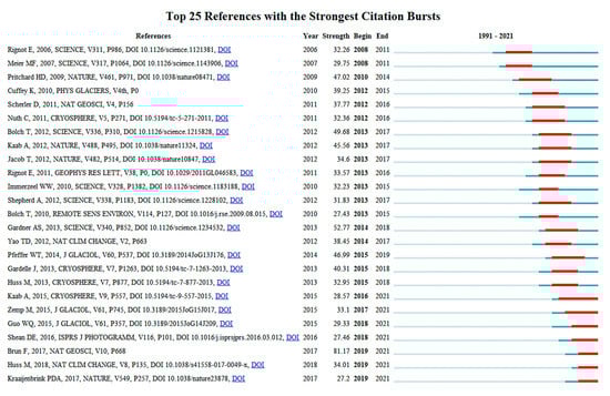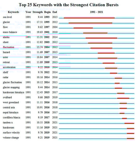 According to Figure 11, the keyword with the highest burst intensity is “mass balance”, which started in 2001 with an intensity value of 19.63. Glacier mass balance can directly reflect the accumulation and ablation of glacier mass and describes the relationship between climate change and glacier feedback by quantifying the mass changes in glaciers [,,]. Glaciers in most parts of the world are almost in negative balance as a result of global warming, and understanding the dynamics of glacier mass balance and finding its patterns is essential for sea level changes, the security of freshwater resources, and abnormal climate fluctuations research.