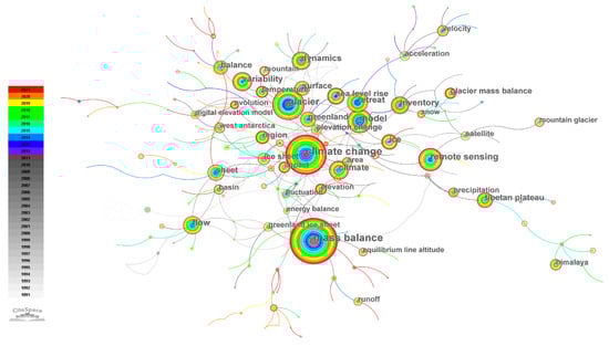 Keywords are a highly summarized form of content. In statistical analysis, it is often necessary to analyze the hotspots of a research topic in conjunction with the frequency of similar keywords, which indicates the topics of common interest among scholars in a research field []. Figure 10 shows the keyword network analysis in the field of glacier mass balance research based on remote sensing. Table 8 lists the most frequently occurring keywords, with “Mass balance” appearing most frequently, with 962 occurrences. “Climate change”, “Glacier”, “Remote sensing”, “Model”, “Retreat”, and other relatively large nodes indicate that they are the keywords frequently used by scholars when publishing papers. This is related to the fact that glacier mass balance and remote sensing were used as keywords in the search and that climate change is causing most glaciers to show a retreating trend.