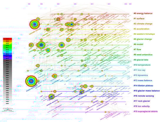 Bibliometrics is a discipline that takes the document system and bibliometric characteristics as the research object and uses mathematical, statistical, and other quantitative research methods to study the distribution structure, quantitative relationship, change rules, and quantitative management of document information, and then discusses some structures, characteristics, and laws of science and technology []. Information visualization is an interdisciplinary field, which aims to study the visual presentation of large-scale non-numerical value information resources and help to understand and analyze data by graphics and images []. Knowledge mapping is a graphical representation that combines bibliometric methods and information visualization principles to show the evolution and structural relationships of scientific knowledge []. CiteSpace is a java application for literature analysis and visualization developed by Prof. Chaomei Chen of the Drexel University School of Information Science and Technology. Its main function is to present the key evolutionary paths of research fields through metrological modeling and mapping of literature related to research fields, helping users to detect research frontiers and realize the transformation of literature research from subjective fragmentation to objective panorama []. Based on this approach, the paper finds the key and active themes and explores the frontier and hotspots for objectively understanding the whole picture of glacier mass balance research based on remote sensing technology.