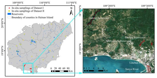 Hainan Island is the main island of Hainan Province which is the southernmost province of China. Often promoted as “China’s Hawaii”, the climate of Hainan Island is tropical—characterized by hot and humid summers, with mild, pleasant winters. Rainfall in Hainan Island is abundant; the average annual precipitation is 1800 mm but with an uneven spatiotemporal distribution [,,]. Considering islands in general, their relatively small size compared to that of mainland regions renders them particularly vulnerable to economic and environmental stresses imposed by rapidly growing populations, increasing economic development, and global climate change [,,]. Freshwater represents one of the most precious resources and vulnerable ecosystems on islands. For Hainan Island, although the overall inland water is relatively rich, most of the water bodies consist of smaller artificial reservoirs with an area of less than 10 km2 [,]. With the acceleration of urbanization on Hainan Island, its lakes and reservoirs are facing increasingly serious water quality issues, such as industrial pollution, domestic sewage, and other water pollution. Recently, Hainan Province was identified as a target for multiple conservation measures including water quality consolidation and improvement and ecological protection of its critical lakes, reservoirs, and watersheds. Moreover, the 2018 construction of the “Hainan Free Trade Port” and the 2021 designation of Hainan Province as a distinctive provincial demonstration area in China for the implementation of Sustainable Development Goals (SDGs) has further promoted protection of the island’s hydro-ecological environment. The hydro-ecological environment of Hainan Island is vital to the overall development of Hainan Province and its water has been specifically recognized as a target of the United Nations (UN) SDGs, of which, SDG 6 is set to “provide and sustainably manage water and sanitation for all”. In the specific target indicators, SDG 6.3.2 is defined as the proportion of water bodies in the country with good ambient water quality []. Therefore, the monitoring of inland water quality on Hainan Island is important for evaluating SDG 6.3.2 and understanding the water quality status of its inland water bodies.