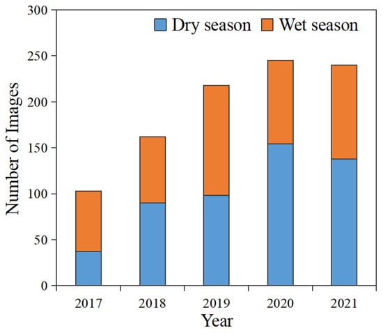 The Sentinel-2 MSI Level-2A (L2A) data used in this study were surface reflectance data atmospherically corrected by the Sen2Cor processor based on Sentinel-2 Level-1C (L1C) data. Sentinel-2 MSI L1C data covering Hainan Island from 2017–2018 were acquired from the official website of the European Space Agency (ESA) (https://scihub.copernicus.eu/dhus/#/home, accessed on 1 April 2022) and then atmospherically corrected for surface reflectance data using the Sen2Cor processor plugged into the Sentinel Application Platform software. The Sentinel-2 MSI L2A data from 2019–2021 were obtained from the Google Earth Engine (GEE) cloud platform. The surface reflectance data were cloud masked using the QA60 band included in the Sentinel-2 products. Based on the cloud mask, images with >30% cloud cover were excluded. Finally, 968 images were obtained. The specific number of images in the wet and dry seasons each year is shown in Figure 2.