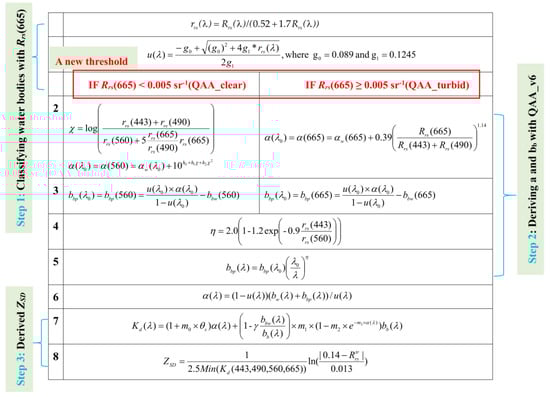 In this study, the semi-analytical ZSD model based on Quasi-Analytical Algorithm (QAA v6) proposed by Lee et al. [] was modified to adapt the water clarity retrieval of inland water bodies on Hainan Island.