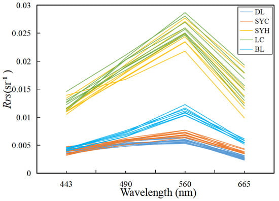 Spectral curve Dataset I at 443, 490, 560, and 665 nm. (DL: Dalong Reservoir; SYC: Shuiyuanchi Reservoir; SYH: Sanya River; LC: Linchun River; BL: Banling Reservoir).