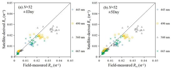 Comparison between the quasi−synchronous in situ measured Rrs(λ) and Sentinel−2 MSI remote sensing reflectance. (a) ±1 Day. (b) ±5 Day.