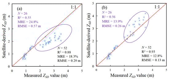 Validation of the model using Dataset I and matched Sentinel-2 data. (a) The ZSD-QAAv6 model, (b) the ZSD-QAAv6m model.