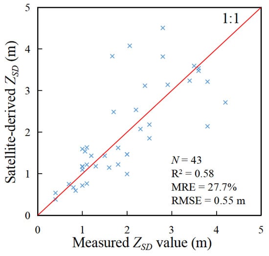 In order to evaluate the performance of the corrected remote sensing reflectance and the ZSD model, this study uses three indicators: the determination coefficient (R2), the mean relative error (MRE), and the root mean square error (RMSE). The calculation formulas are as follows: