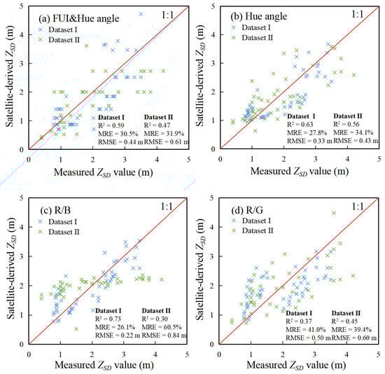 Model comparisons of the (a) FUI and Hue-angle model, (b) Hue-angle model, (c) Red–Blue ratio model, and (d) Red–Green ratio model in Datasets I and II.