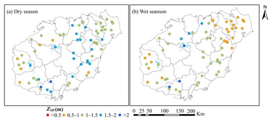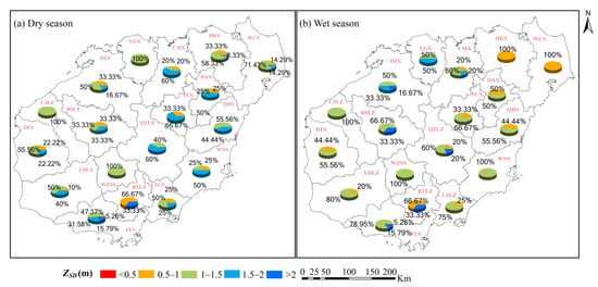 Average proportion of annual ZSD water bodies in the (a) dry and (b) wet seasons for inland water bodies on Hainan Island from 2017–2021.