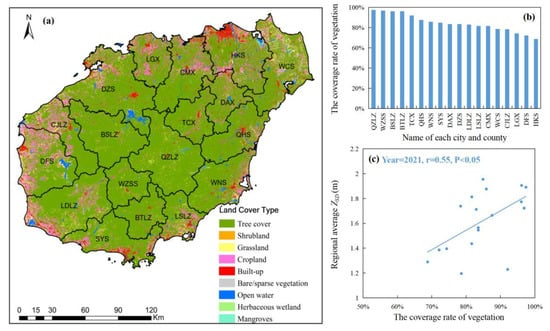 Land-cover types on Hainan Island and their correlation with regional water clarity. (a) The land-cover type of Hainan Island in 2021, (b) the coverage rate of vegetation (including tree cover, shrubland, grassland, and cropland) in regions of Hainan Island, (c) correlations between the Sentinel-2-derived water clarity and vegetation cover in regions of Hainan Island.