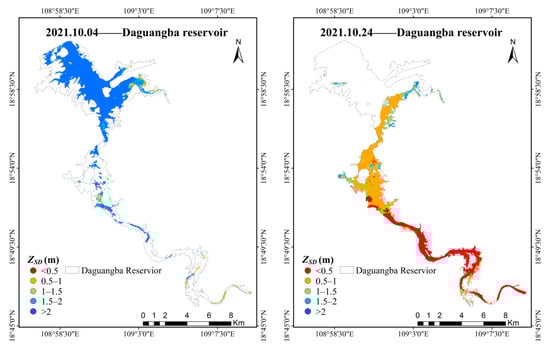 Climate factors are widely recognized as the primary driver of clarity in lakes and reservoirs. As a typical island water system, the inland water bodies of Hainan Island can be largely impacted by rainfall in the region. With heavy rainfall in the wet season, suspended matter and nutrient substances would be brought into water bodies with surface runoff [,,]; therefore, the water clarity can be relatively low in this season. In contrast, the water clarity can be higher in the dry season when there is little rainfall and runoff. Moreover, due to the typical tropical island climate, the heavy rainfalls are usually accompanied by strong winds and even typhoons in the coastal regions []. Therefore, the inland water bodies in the surrounding coastal regions seem to be more vulnerable to rainfall, typhoons, and other climatic factors. In order to further explain the impact of typhoons on water clarity, this study analyzed the changes in water clarity before and after a typhoon. On 13 October 2021, typhoon “Kompasu”, the strongest typhoon to make landfall in Hainan Province in the last 5 years, made landfall in Qionghai City on Hainan Island. Given the typhoon path released by the Hainan Meteorological Information Service Website, the Daguangba Reservoir was used as an example to show the spatial variation of the water clarity in this reservoir before and after the typhoon. As shown in Figure 13, the water clarity of the Daguangba Reservoir decreased significantly after the typhoon. By mixing the water body and bringing in sediments through heavy rainfall, the typhoon caused an obvious decrease in water clarity of the water body.