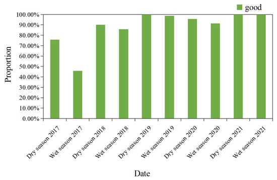 ZSD is an important and comprehensive optical water quality parameter, which reflects the cleanness of water bodies and the overall water quality to a certain extent [,]. In the UN SDG 6, the indicator of SDG 6.3.2 is “the proportion of water bodies with good ambient water quality” []. Therefore, the water clarity retrieved by Sentinel-2 data can be used to evaluate water quality, as it can be satisfactorily estimated with satellite data [,]. Here, water bodies with average water clarity larger than 0.5 m were identified as having good ambient water quality, because that value is usually regarded as a simple criterion for assessing eutrophic state in inland waters []. Therefore, the proportion of water bodies with good water quality in the Hainan Island was evaluated from 2017–2021 using the satellite-derived water clarity data. As shown in Figure 14, the results indicate that the proportion of water bodies with good water quality on Hainan Island was relatively low in 2017 (~75% in the dry season and ~45% in the wet season). After 2018, there was a significant increase in the proportion of water bodies with good water quality on Hainan Island. By 2021, the proportion of water bodies with good water quality in the dry and wet seasons had reached 100%. This indicates that the overall water quality of inland water bodies on Hainan Island improved from 2017–2021.
