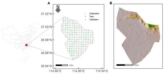 The study area is located in Ji’an County, eastern Jiangxi Province (Figure 1), and covers 2470 ha at altitudes ranging from 50 to 60 m above sea level. The location is distributed on both sides of the tributaries of the Ganjiang River with flat terrain. The predominant soil types came from river alluvials. This area is used for high-quality prime farmland []. Soil texture varies from loamy sand to clay. We collected 261 samples on a regular grid of 300 × 300 m from the arable layer (0–20 cm) (Figure 1). In this study, we used soil organic matter (SOM), which can be documented to be accurately estimated by vis-NIR.