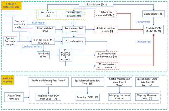 Dataset from the combination and the mapping flowchart. The letters (A)–(D) correspond with data of the laboratory-based (Lb), vis-NIR augmented datasets (Au.p), the laboratory-based with pcs covariate (Ld.co), vis-NIR augmented datasets with pcs covariate (Au.p.co).