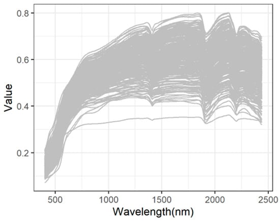Apparent water absorption peaks were observed in the vis-NIR spectra bands near 1400 nm and 1900 nm, as shown in Figure 3. The absorption peaks near 2200 nm indicated the existence of kaolinite in the soil samples []. In addition, the absorption spectra at approximately 450 and 850 nm showed goethite and hematite, which are characteristic of iron-bearing minerals []. Three samples had a higher reflectance at 600–1400 nm than the rest of the soil samples because of their relatively late development [].