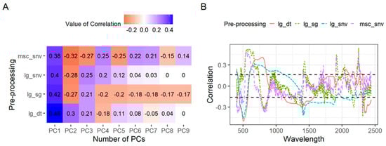 The correlation of SOM with principal components (PC1:PC9) calculated from the spectroscopy reflectance R with four preprocessing methods (A) and of SOM with spectra with four preprocessing methods (B). Note: lg_sg: Savitzky-Golay of log(1/(R)), lg_snv: standardNormalVariate of log(1/(R)), msc_snv: multiplicative scatter correction + standardNormalVariate of log(1/(R)), lg_dt: detrended normalization of log(1/(R)). Note: lg_sg: Savitzky-Golay of log(1/(R)), lg_snv: standardNormalVariate of log(1/(R)), msc_snv: multiplicative scatter correction + standardNormalVariate of log(1/(R)), lg_dt: detrended normalization of log(1/(R)). The two values from the black dotted lines are correlation values whose p value was significant (p < 0.01).