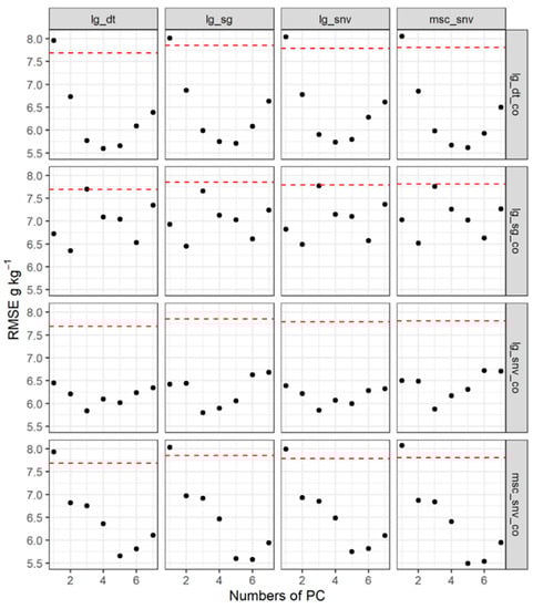Figure 5 shows that along each row, the change in RMSE was similar, but along each column had a difference, which showed that the effect from the spectra as the covariate was larger than the vis-NIR augmented data induced from the different preprocessing. When considering the whole from each line, the difference from lg_snv_co with different PCs was the smallest among the four lines. The results from lg_dt_co and msc_snv_co had the same trend, but the number of PCs with the lowest RMSE value was different, with the former being four and the latter being five. The RMSE from lg_sg_co showed that the lowest value was PC two.