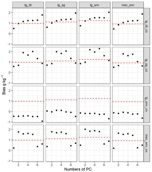 The bias in Figure 6 shows that the different PCs from lg_dt_co and lg_snv_co had little effect. lg_snv_co had a bias that was lower than that without the covariate (lg_snv, Figure 6 red lines). The changes in bias from lg_dt_co were all around the bias value of lg_dt with a short distance except for the seventh PC. When the PC was 3–5, the biases from lg_sg_co and msc_snv_co were higher than those from lg_sg and msv_snv, which showed that when the spectra were used as the covariate, the reduced RMSE was not due to the reduced bias.
