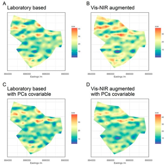 The difference in SOM with their locations from the validation dataset with the spatial model and from vis-NIR augmented models (Figure 7 and Table 3) showed that the use of visible and near-infrared (vis-NIR) spectroscopy for SOM mapping is an alternative to overcome the time and budget constraints, which can be confirmed by several studies [,,,]. However, these researchers only used vis-NIR spectra to predict the properties and did not use vis-NIR spectra as covariates. In this study, we used both the spectra from the test dataset to predict SOM and PCs of spectra from all samples as covariates. We used PC1 to PC7 as the covariates, which were strongly correlated with SOM. When comparing the prediction from the dataset of laboratory-based (Lb) and vis-NIR augmented with PCs as covariates (Au.p.co), the number of samples used for calibration for spatial data was reduced to nearly 60%, but the accuracy improved by 22%. The main difference between the two maps was that the maps predicted with the vis-NIR augmented model were smoother than those predicted with the laboratory-based model. These can be explained by the fact that the prediction from the vis-NIR model tends to smooth the variation.