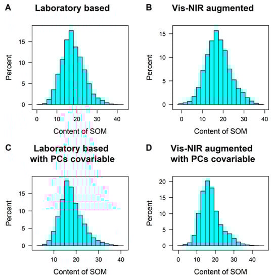 The histogram showed that the percent of predicted SOM in all ranges between the maps from the data of Lb and Au.p had no difference (Figure 8). However, when considering the vis-NIR spectra as covariates, the histograms from Ld.co and Au.p.co in the SOM content range of 12–21 g kg−1 had a larger percentage (58%) than Lb and Au.p (64%), which can also be seen in Figure 8.