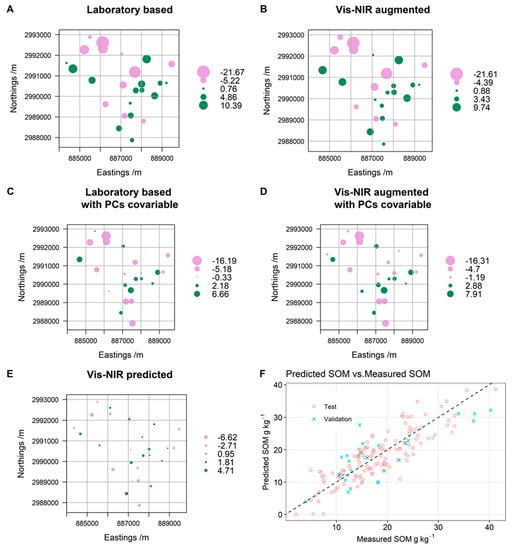 The location of the difference value of predicted and measured SOM from Lb (A), Au.p (B), Ld.co (C), and Au.p.co (D), and from the vis-NIR Model (E) of the validation dataset, the SOM content from the predicted and measured dataset from the test and validation dataset, and the plot of measured SOM and predicted SOM (F). The data showed in (A)–(E) was the difference of the measured SOM minus the predicted SOM.