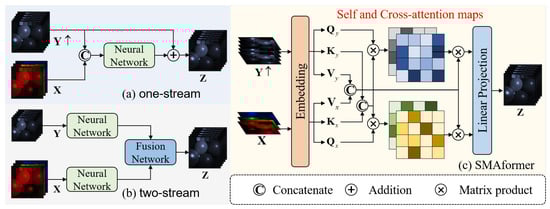 where , , and , , denote the learnable parameters of , , and of and , respectively; and denote the attention of and , respectively, which include self-attention and cross-attention. Subsequently, after concatenating the features obtained from the two pathways, we apply a linear projection, followed by reshaping it to match the same dimensions as the input. Linear projection can be expressed as the following formula: