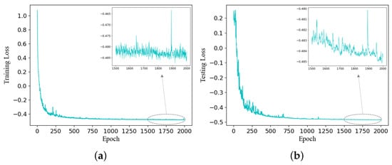 It is evident that both training and testing losses experienced a substantial decline within the initial 250 epochs. However, during the subsequent phases, the rate of decline decelerated. The enlarged images provide further insight, indicating occasional fluctuations in the middle epochs; nevertheless, the overarching trend remains downward, reassuringly indicating an absence of overfitting within this specified range. Despite these positive observations, we opted for a training epoch limit of 2000, considering the pragmatic constraint of time.