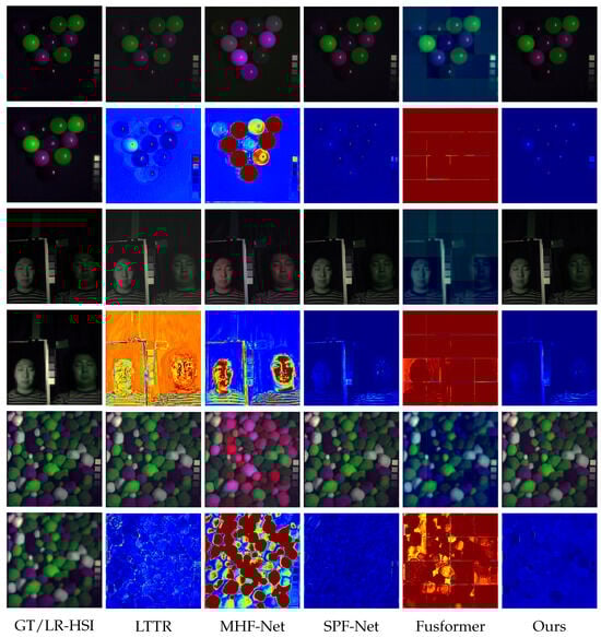 Comparison of results for three images in the CAVE dataset. Superballs in the first and second rows, pompoms in the third and fourth rows, and photo and face in the fifth and sixth rows. In each group of photos, the first column: the top/bottom image indicates the GT/corresponding LR-HSI in pseudocolor (R-3, G-13, and B-2), and the 2nd–6th columns are the visualization images and the corresponding error maps of all compared models [,,,].
