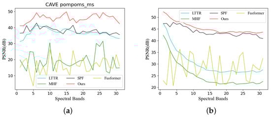Comparison of PSNR index curves of different methods. The figure illustrates the PSNR values of each spectral band for images restored by using various methods in comparison to real images. (a) illustrates the results for pompoms_ms in the CAVE dataset, while (b) presents the results for Imageb9 in the Harvard dataset.