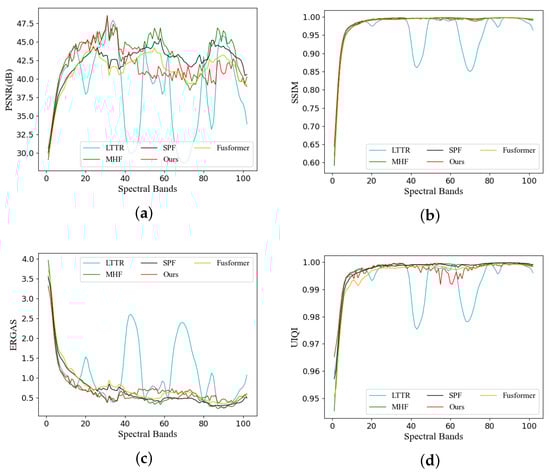 Comparison of indicator curves of different methods in the Pavia Center dataset. (a) The PSNR curve, (b) the SSIM curve, (c) the ERGAS curve, and (d) the UIQI curve.