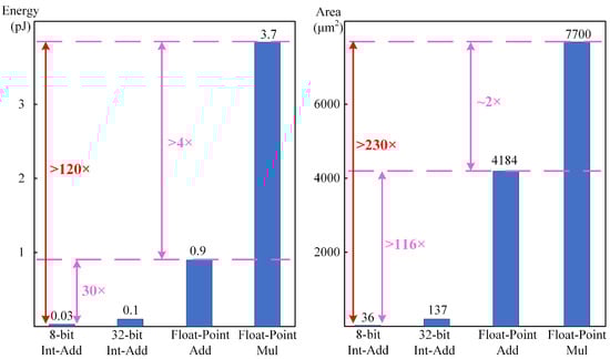 Many researchers have employed model compression methods to reduce model complexity, mainly including low-rank decomposition [,], pruning [,], knowledge distillation [], and quantization [] approaches. Low-rank decomposition methods reduce the redundancies in the specified layers by decomposing the large matrix of convolution kernels; however, these methods cannot perform global parameter compression and are not applicable with the common 1 × 1 convolution kernel []. Pruning methods reduce the computational complexity by removing redundant weights in CNN models; however, they require manual definition of the pruning criteria and fine-tuning to maintain model performance, which is time-consuming and sub-optimal [,]. Knowledge distillation methods aim to enable lightweight models to achieve similar performance as larger models through distilling knowledge from the large model to the lightweight model; however, the design of lightweight models remains an additional challenge []. Quantization approaches reduce the number of parameters and computational demand through converting floating-point numerical representations of models into integer representations; however, ensuring the accuracy of low-bit-width quantized models poses a significant challenge [,]. Moreover, many studies have shown that deploying multiplication operations on edge devices entails more resources and energy overheads, compared to deploying addition operations [,]. Figure 1 shows the energy and area costs for various operations in 45 nm ASICs at 0.9 V []. Most of the multiplication operations in CNN models are concentrated in convolutional layers []. Although the above-mentioned model compression methods can achieve a reduction in model complexity, optimized CNN-based models still heavily rely on convolutions involving billions of multiplication operations. Consequently, directly applying such models for onboard deployment remains challenging.
