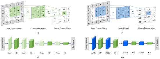 Based on adder filters, Zhang et al. [] proposed an A2NN, which converts all convolution filters in the CNN into adder filters. The architectures of the CNN and A2NN models are depicted in Figure 2c,d, respectively.