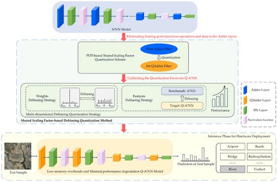 To address these issues, this article proposes a novel shared scaling factor-based de-biasing quantization (SSDQ) method to reduce the memory overhead of A2NNs while minimizing performance degradation. The proposed SSDQ method includes a powers-of-two (POT)-based shared scaling factor quantization scheme and a multi-dimensional de-biasing (MDD) quantization strategy. Specifically, the POT-based shared scaling factor quantization scheme converts the adder filters with 32-bit floating-point (FP32) input activations, weights, and operations to quantized adder filters with hardware-friendly integer input activations, weights, and operations. Thus, the Q-A2NNs composed of quantized adder filters have lower computational and memory overheads than existing basic networks such as CNNs and A2NNs. The reduced accuracy of Q-A2NN for RSSC tasks can be alleviated through the proposed MDD quantization strategy. The MDD strategy combines a weight-debiasing (WD) strategy, which reduces the performance degradation caused by deviations in the quantized weights, with a feature-debiasing (FD) strategy, which enhances the classification performance of Q-A2NNs through minimizing the deviation in the output features of each layer.