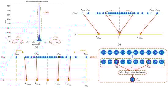 The weights of adder filters in well-trained A2NN models often follow Laplacian distributions [,]; therefore, for a well-trained A2NN model, many weights are concentrated around zero. Figure 4a illustrates the parameter count histogram for the adder filter in the first layer of the well-trained A2NN-VGGNet-11 model []. It can be seen that the weight distribution of the adder filters is skewed. While the weight distribution of this filter ranges from to 40, most weights are distributed between and 2, accounting for over 80%. In contrast, the weights with values below or above 20 are rare, accounting for less than 1%. As the weight scaling factor is determined according to the boundary values of the weight distribution and , the quantized weights may seriously deviate in low-bit-width Q-A2NN. As shown in Figure 4b, when the target quantization range is much smaller than the actual weight distribution range, many weights that are densely distributed around zero are compressed to the integer zero after quantization. Thus, most of the information in the well-trained full-precision A2NN model is lost during quantization, resulting in a severe decrease in accuracy. Notably, the deviation in the weight distribution after quantization escalates as the quantization bit width decreases.