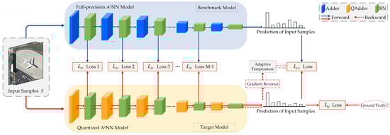 Notably, determining the appropriate hyperparameter T for Q-A2NN models with different bit widths is difficult and resource-intensive. Inspired by [], an adaptive temperature is introduced for adaptation to Q-A2NN models with different bit widths. Furthermore, the adaptive temperature is learned utilizing a reverse gradient strategy that aims to maximize . Through gradually increasing the challenge posed to the Q-A2NN model in emulating the classification boundary of the well-trained full-precision A2NN model, an adversarial process is introduced to continually improve the Q-A2NN model’s feature extraction capability. Consequently, the feature extraction ability of the Q-A2NN model approaches that of the benchmark A2NN model. The adaptive temperature T can be updated using the reversed gradient as follows: