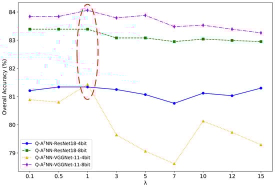 According to Table 2 and Table 3, the Q-A2NN model sets (SSDQ) had the same or even lower performance degradation, when compared with the Q-CNN model sets quantized using the symmetric uniform quantization scheme [,]. Moreover, the memory overhead of the Q-A2NN model sets (SSDQ) and Q-CNN model sets during the inference phase were identical. For example, the performance degradation of the Q-A2NN-VGGNet-11-4bit models (SSDQ) was nearly 0.19%, 0.49%, and 1.28% lower than that of the Q-CNN-VGGNet-11-4bit models for the RSSCN7, WHU, and SIRI-WHU data sets, respectively. The memory overhead required to deploy these models was the same—approximately 4.42 MB. Notably, on some data sets, the accuracies of Q-A2NN model sets (SSDQ) even surpassed that of full-precision CNN models, and the computational and memory overheads were much lower than those of the CNN models.