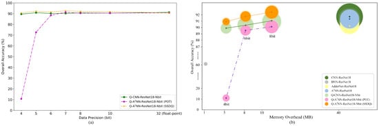 Comprehensive performance comparison of different models on the WHU data set: (a) OA of the Q-CNN-ResNet-18-Nbit models and Q-A2NN-ResNet-18-Nbit models (SSDQ); and (b) comparisons of the OA and resource overhead of various models.