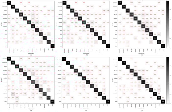 Confusion matrices of different models on the SIRI-WHU data set: (a) The CNN-VGGNet-11 model; (b) the Q-CNN-VGGNet-11-6bit model; (c) the AdderNet-VGGNet-11 model; (d) the BNN-VGGNet-11 model; (e) the A2NN-VGGNet-11 model; and (f) the Q-A2NN-VGGNet-11-6bit model (SSDQ).