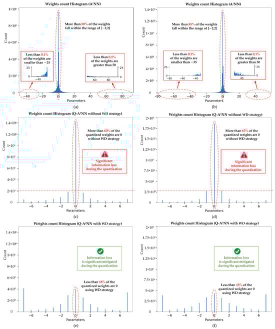 The proposed WD strategy can effectively alleviate the severe decrease in accuracy of the Q-A2NN caused by deviations in the weight distribution during quantization, the details of which are presented in Figure 4c. When the weight distribution is skewed and the weight distribution range is much more extensive than the target quantization range, the median value reflects the actual weight distribution better than and . Therefore, when the weight scaling factor obtained using the boundary values and exceeds 1, the weight scaling factor is re-defined as: