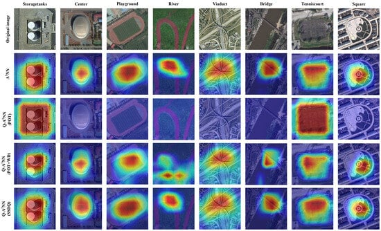Moreover, the gradient-weighted class activation mapping (Grad-CAM) method [] was employed to visually assess the impact of the proposed SSDQ method. The resulting class activation map (CAM) is presented as a thermal map, illustrating how the models focus on specific regions of the input image. In the visual representation, regions with stronger responses are highlighted in red, whereas regions with lower responses are depicted in blue. Figure 10 shows the CAM results for eight classes of images randomly selected from the five public RSSC data sets. From top to bottom is the input image, the CAM corresponding to the A2NN-VGGNet-11 model, the CAM corresponding to the Q-A2NN-VGGNet-11-4bit model (POT), the CAM corresponding to the Q-A2NN-VGGNet-11-4bit model (POT + WD), and the CAM corresponding to the Q-A2NN-VGGNet-11-4bit model (SSDQ). The CAM generated by the Q-A2NN-VGGNet-11-4bit model (POT) did not effectively capture critical information in the remote sensing images, as the feature extraction ability possessed by the well-trained A2NN model was severely degraded due to the deviations in the quantized weights and features caused by low-bit-width quantization. With the introduction of the WD strategy, the CAM generated by the Q-A2NN-VGGNet-11-4bit model (POT + WD) could successfully concentrate on the crucial regions in most scene classes. However, it can still be observed, from the CAM results of certain scene classes, that critical parts (e.g., storage tanks and rivers) were not fully covered or even could not be extracted accurately, indicating a certain discrepancy compared with the A2NN model. In contrast, the Q-A2NN-VGGNet-11-4bit model (SSDQ) obtained through incorporating the proposed SSDQ method comprehensively covered the critical parts in the remote sensing scenes while minimizing interference from intricate backgrounds. Taking the center and tennis court as examples, the Q-A2NN-VGGNet-11-4bit model (SSDQ) located the critical regions more comprehensively than the A2NN model. The above analysis indicates that the classification performance of Q-A2NN models can be significantly enhanced through the use of the SSDQ method.
