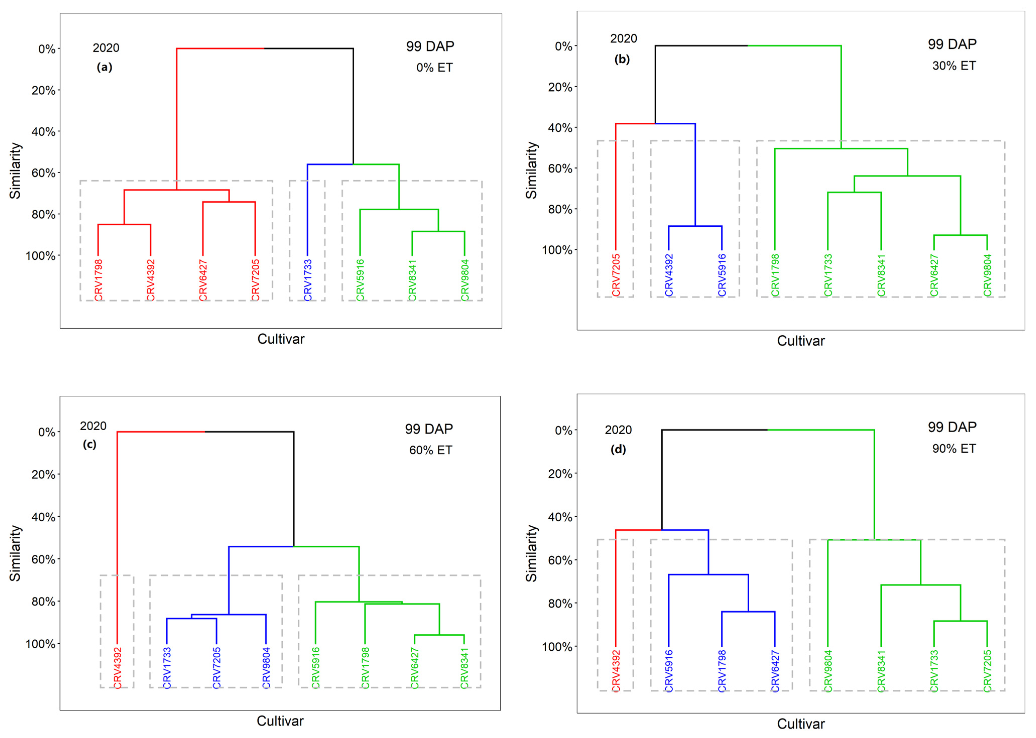 Hierarchical cluster analysis of cultivars under different irrigation rates ((a): 0% ET, (b): 30% ET, (c): 60% ET, (d): 90% ET) at 99 DAP in 2020 (DAP: days after planting).