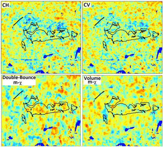 Table 1 shows the Root Mean Square Error (RMSE) values for the evaluation of soil moisture between SAR-derived products and in situ measurements collected at the meteorological station. The lowest RMSE values for this station were achieved with CV, RL, and the surface component of m-χ decomposition. The scattering mechanisms remain relatively stable with soil moisture changes (i.e., χ remains constant), thus the change occurs primarily in the span and degree of polarization, where the three m-χ parameters are linearly linked. The difference in RMSE among the components of m-χ decomposition can be attributed to the signal-to-noise ratio of the intensities of those scattering mechanisms.