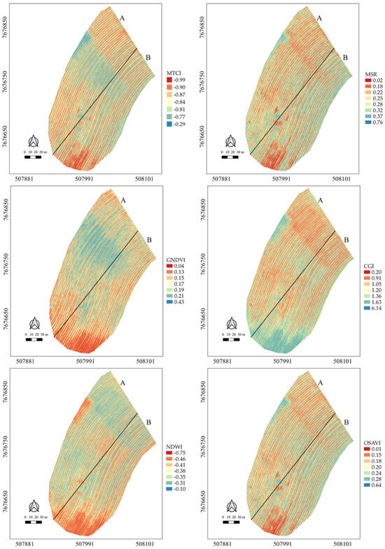 In the one-year-old coffee plants, the vegetation indices that most accurately reflect frost damage effects were NDVI, MSR, OSAVI, SAVI, MCARI1, and MCARI2 (Figure 2). These indices exhibited higher values in the low-risk zone compared to the high-risk zone. However, the NDRE, MTCI, GNDVI, CGI, and NDWI index maps did not clearly delineate the climate risk zones.