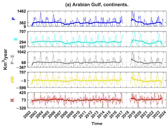 In this study, we used GRACE and ERA5 data to investigate the hydrological cycle of the Arabian Gulf and its surrounding continental catchment region. The methodology employed has previously been successfully applied in the main ocean basins [], the Mediterranean and Black Seas [], and the Baltic Sea []. However, the Arabian Gulf is of a smaller size, approaching the resolution limit of this method, which is constrained by the ~300 km spatial resolution of GRACE. This limitation mainly arises from those grid points situated in proximity to the coastline, where signal leakage resulting from topographic effects becomes a significant concern. This is the reason why the grid points in the continental catchment region that are closer than 111 km to the coast (2 grid points in the resampled regular grid) were deleted. For example, if those points were not eliminated, the climatology of R would have significantly negative values in October (–107 ± 25 km3/year) and November (–63 ± 45 km3/year). Those months with negative R represent a WT from sea to land, which could be explained by the transport of desalinated water from the sea to the continents. However, although the Arabian Gulf countries produce about 45% of the global desalinated water, it accounts for only 4 km3/year [], which is insufficient to explain the negative values of R. Another potential explanation for these negative values could be the infiltration of seawater into the continental underground water deposits, although there are currently no measurements to support this hypothesis. It is our contention that these negative values are an artifact, produced by a leakage signal from the sea in continental points near the coast in GRACE measurements.