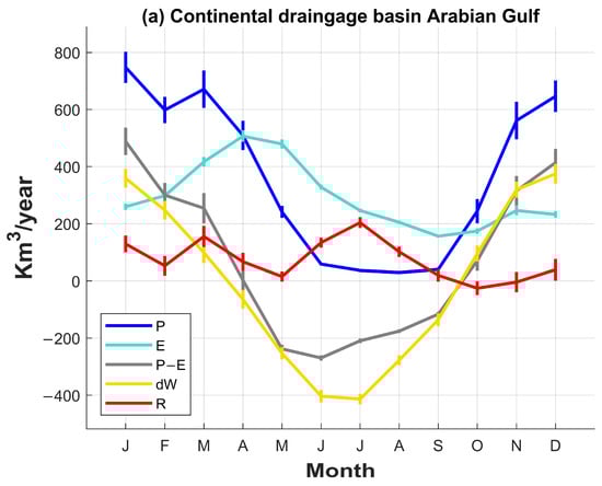 The results obtained here were analyzed on an average, seasonal, and non-seasonal scale. In general, we found good agreement with previous results. For example, our climatology of P for the continental catchment was similar to that obtained for the Arabian Peninsula in [], despite some differences in the study area and time period.