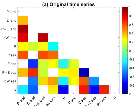 In the continental catchment region, the non-seasonal variability of P propagates to P–E, dW, and R. The Pearson correlation coefficients between P and P–E, R, and dW are 0.97 ± 0.01, 0.59 ± 0.04, and 0.62 ± 0.05, respectively (Figure 5b). P also shows a high correlation with E (0.68 ± 0.04), which could be due to the fact that above (below) average amounts of P allow for more (less) water to evaporate. Although the correlations between E and P–E, R, and dW are significant, they are lower than those with P, suggesting that P is the main driver of non-seasonal variability on land. It is also noteworthy that the correlation between R and P–E increases to 0.63 ± 0.04 when the seasonality is removed.