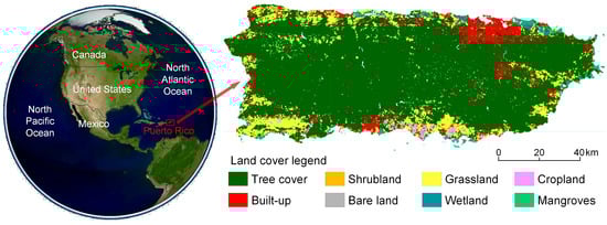 The central mountain range, known as the Cordillera Central, runs east–west across the island, with the highest peak, Cerro de Punta, reaching an elevation of 1338 m. Puerto Rico’s tropical forest ecological zone experiences a tropical maritime monsoon climate, with an average annual temperature of 26 °C and minimal seasonal variation. Year-round temperatures generally range between 20 °C and 30 °C, and the island receives an average annual precipitation of about 1400 mm []. The primary land cover types in Puerto Rico include forests, shrublands, grasslands, built-up areas, water bodies, and wetlands []. Common tree species found in the island’s tropical forests include Prestoea acuminata (palm), Manilkara bidentata (balata), Cocos nucifera (coconut), and Piones mangroves []. The study area was selected because of its diverse and structurally complex forests, which present both challenges and representativeness, and because publicly available airborne lidar data are available for independent accuracy validation.