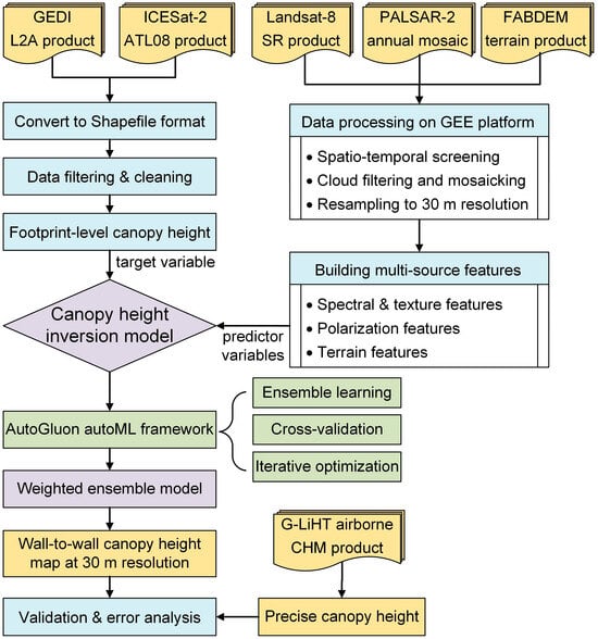 Figure 2 presents a flowchart outlining the data and processing methods employed in this study. This study utilized a combination of remote sensing datasets to construct canopy height inversion models for tropical forests. The primary datasets included ICESat-2 and GEDI lidar products, which were used to obtain footprint-level forest canopy height measurements. High-resolution airborne lidar data from the G-LiHT (Goddard’s Lidar, Hyperspectral and Thermal Imager) [] were employed for independent accuracy validation. Additionally, Landsat-8 multispectral imagery was used to extract spectral and textural features, while PALSAR-2 SAR imagery was used to derive polarization features. Topographic features were obtained from the FABDEM (Forest And Buildings removed Copernicus Digital Elevation Model) terrain product []. To ensure consistency and comparability in the analysis, all datasets were carefully processed for spatial resolution and temporal alignment. This preprocessing step was essential to guarantee that the data sources were appropriately matched in terms of spatial and temporal scales, allowing for accurate canopy height mapping across the study area.